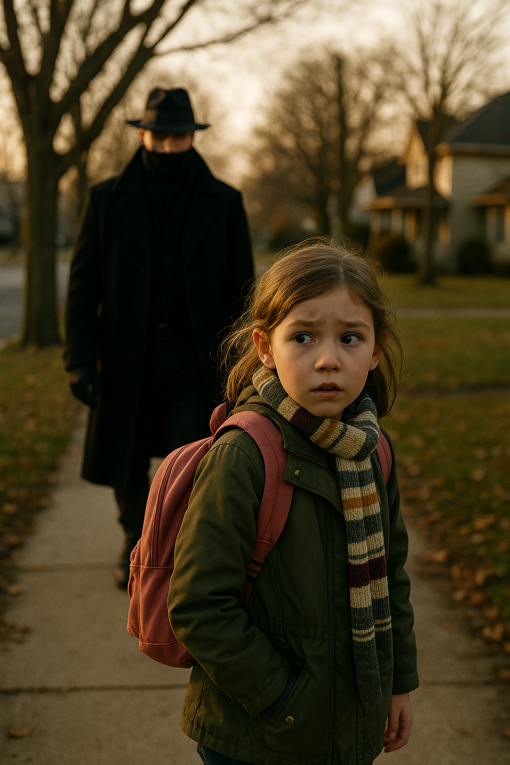 It was supposed to be an ordinary Tuesday. Seven-year-old Mia Caldwell was walking home from school, humming the theme from her favorite cartoon and counting the cracks in the sidewalk like she always did. Her purple backpack bounced behind her, one shoelace untied, and her scarf dragging dangerously close to the pavement.