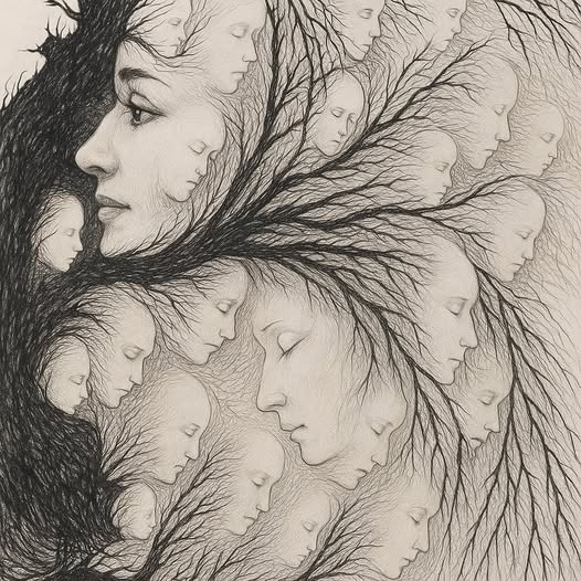 At first glance, this artwork seems like a simple portrait of a face surrounded by delicate lines. But if you look closer, the branches transform into countless faces, each with their own quiet expression. It’s as though the drawing whispers a story about identity, memory, and the intricate web of human connection. The image feels alive, pulling you into a forest of souls where every branch holds a history.