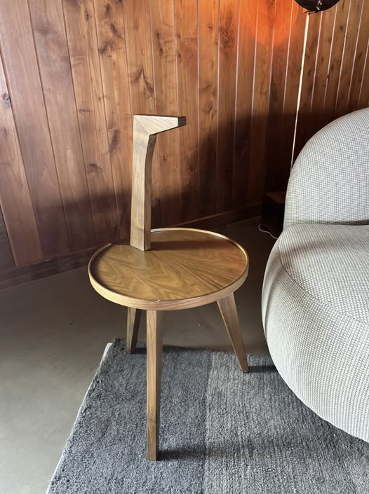 I was in a cozy, cabin-like living room—wood paneling, warm lighting, the faint scent of vintage books—when my eyes landed on a curious table. Round top, three thin legs, and a single vertical “handle” jutting up like a bird stretching its neck. I had to ask, “What is that?” It was the Franco Albini Cicognino side table, designed in 1954.